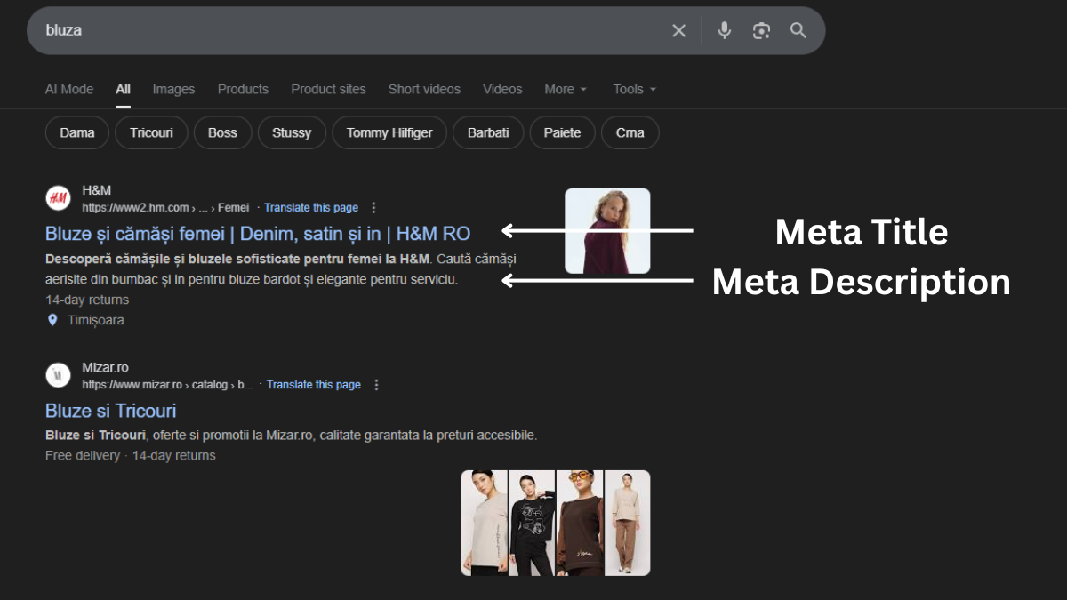 - Ele sunt acele fragmente mici de cod HTML care nu se văd direct pe site, dar spun motoarelor de căutare despre ce e pagina ta, ce cuvinte-cheie sunt importante și cum să afișeze pagina în rezultate. Imaginează-ți că pagina ta este un magazin. Meta tag-urile sunt semnele de pe vitrină: dacă sunt clare și atrăgătoare, oamenii vor intra; dacă lipsesc sau sunt confuze, trec mai departe fără să bage în seamă.